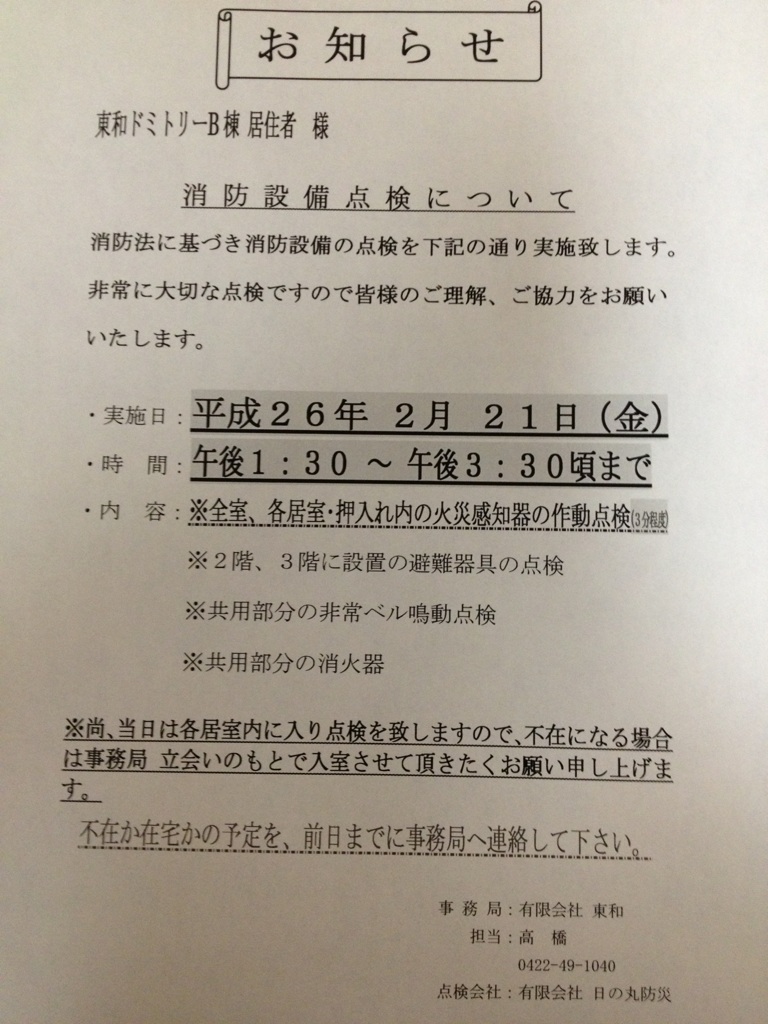 B棟全館の消防法に基づく設備点検を
