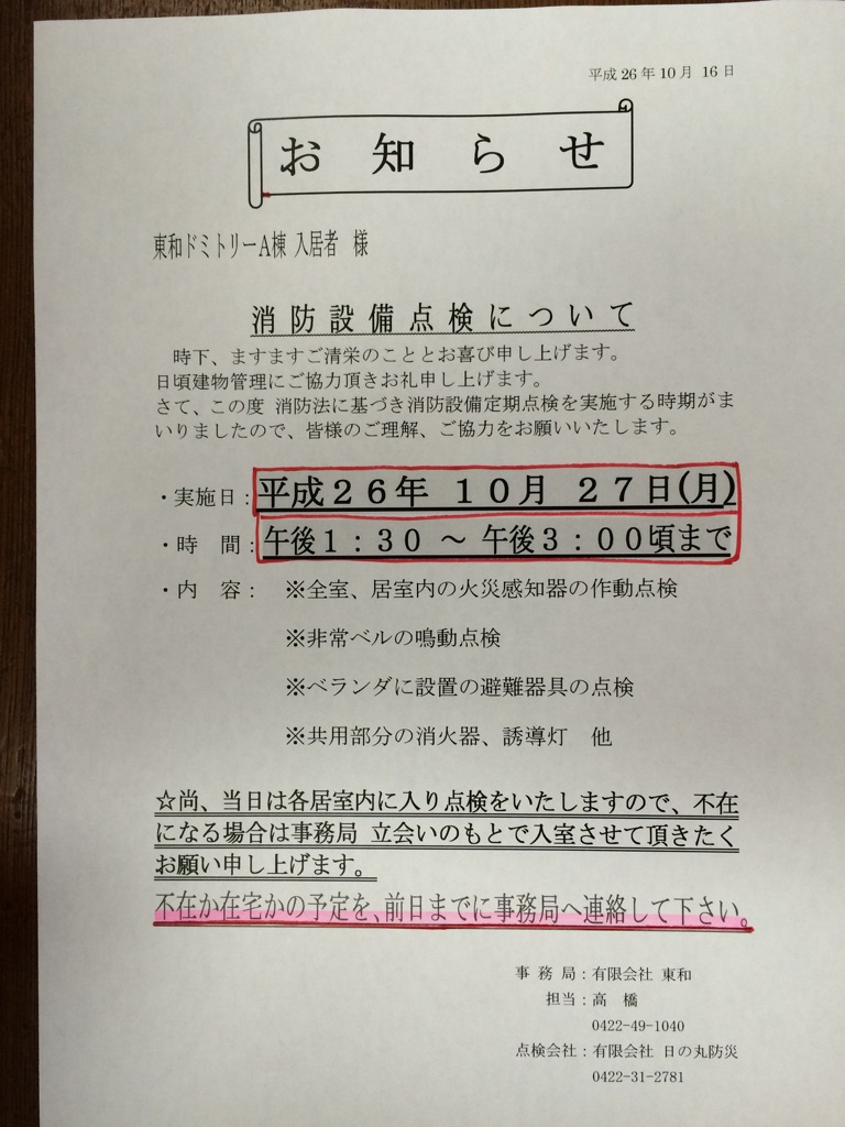 消防設備点検が実施されます。
